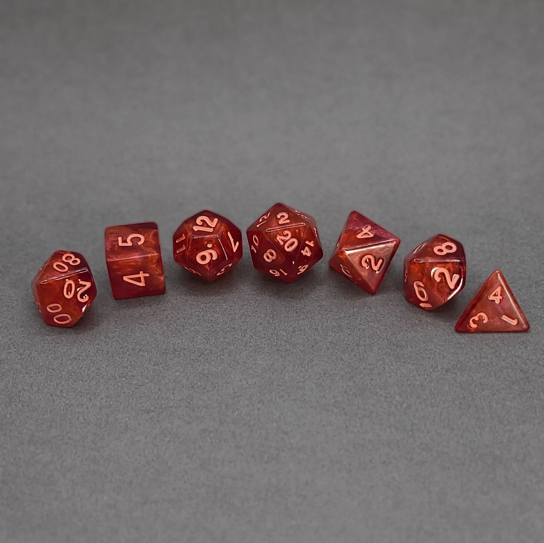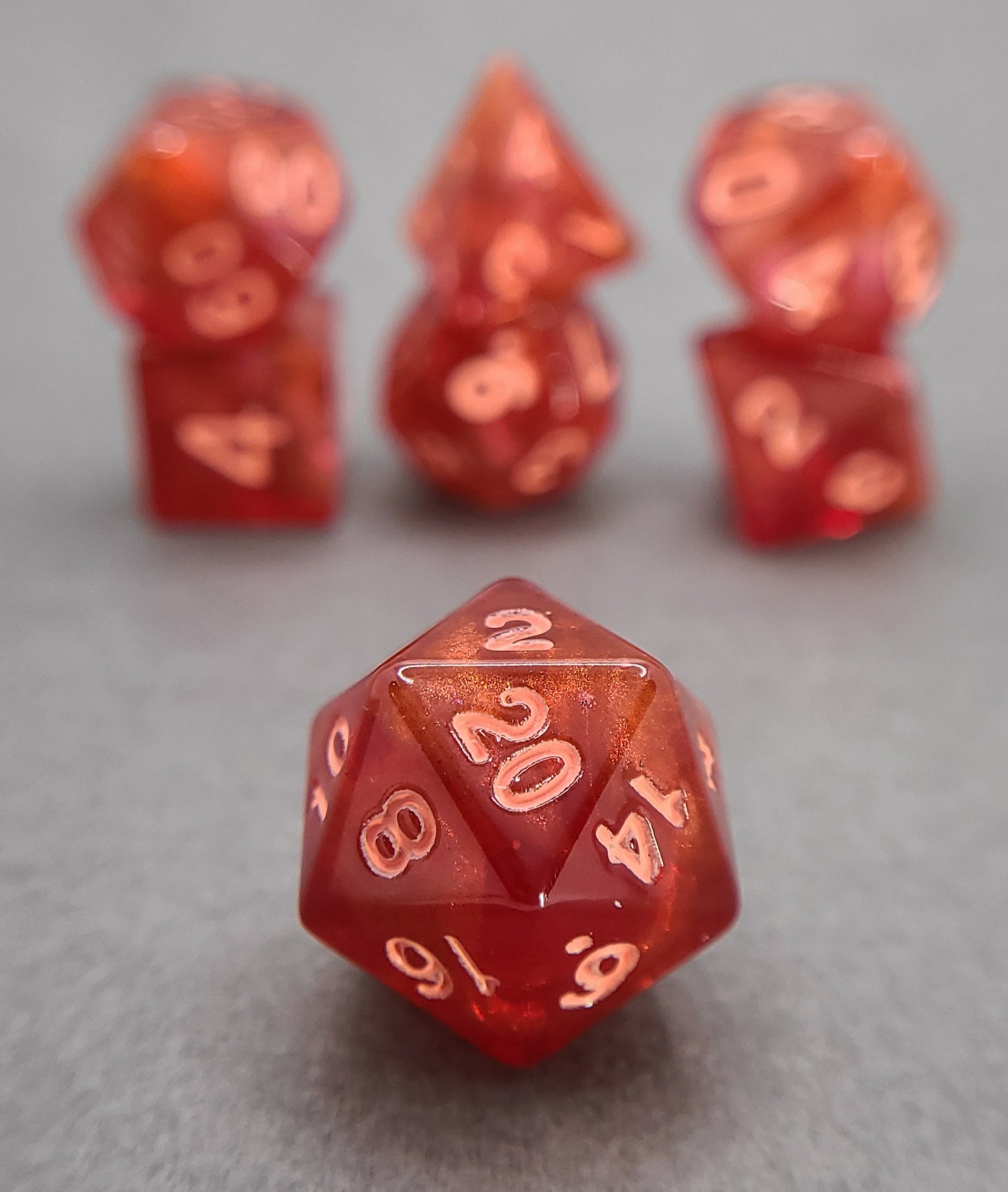 Reds and oranges are swirled with tasteful glitter and topped with peach numbering in this set, which includes a standard 7 polyhedral dice (D4, D6, D8, D10, D%, D12, and D20).