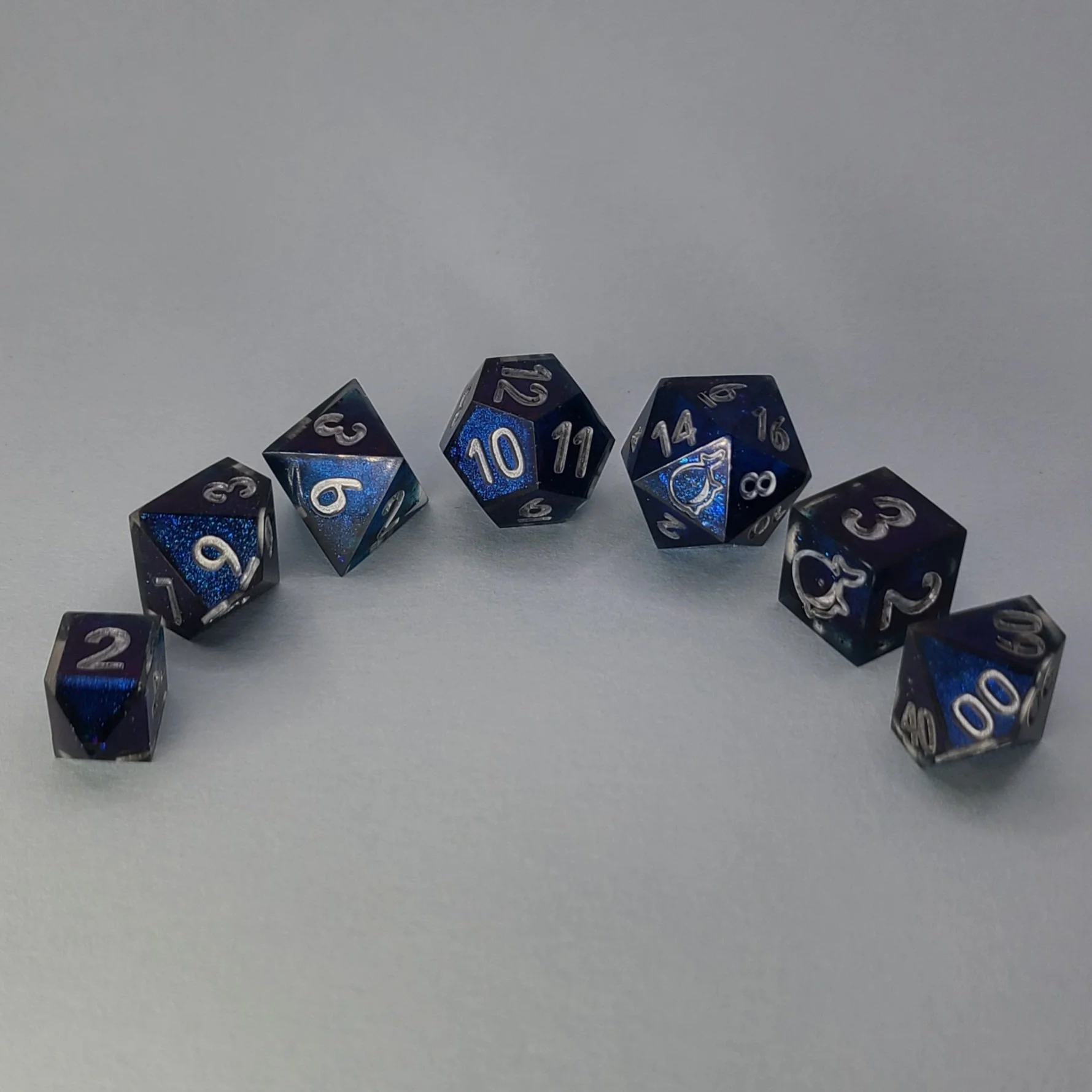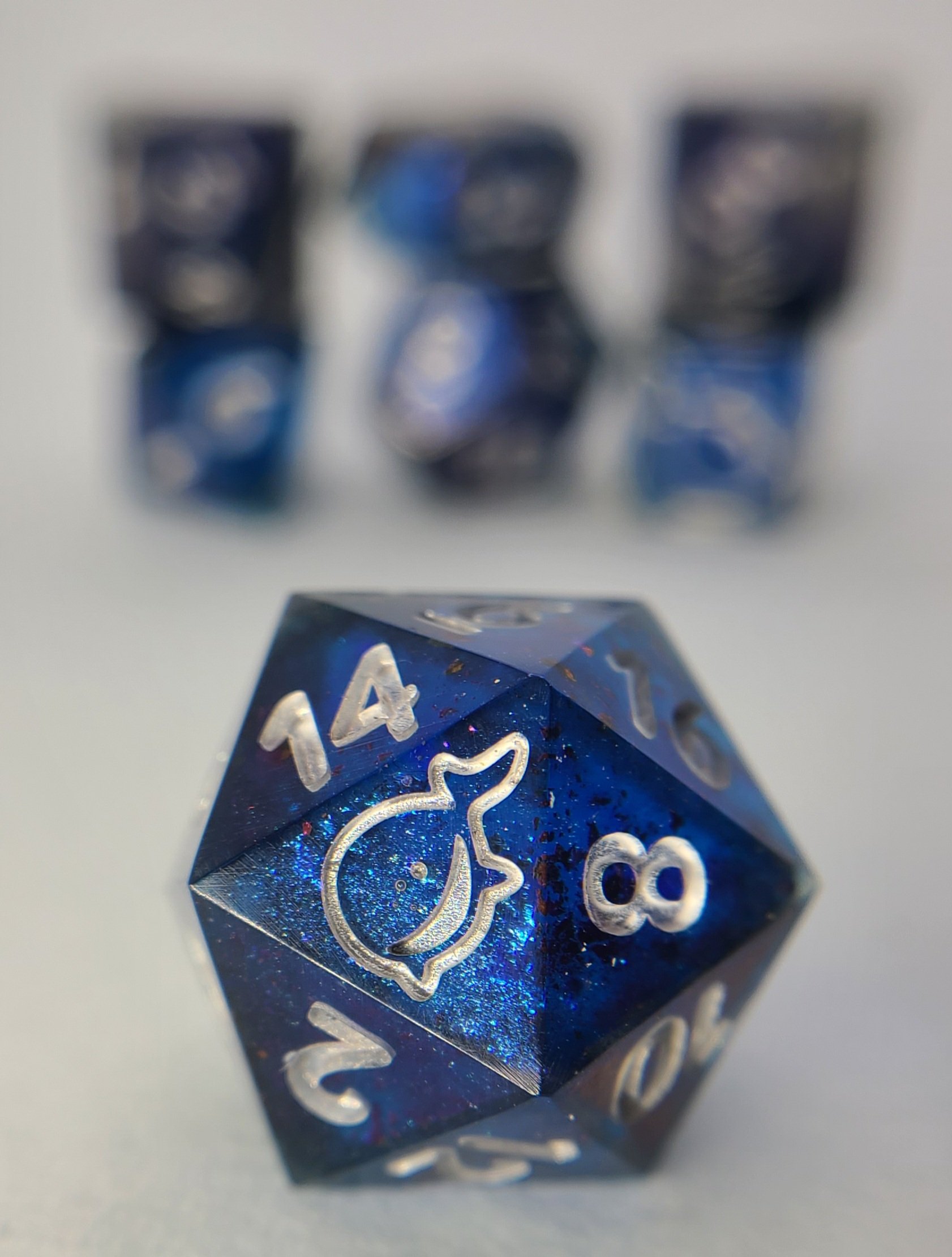 The set includes a standard 7 polyhedral dice (D4, D6, D8, D10, D%, D12, and D20). The highest numbered face on the D6 and D20 are inscribed with Westley the Whale.