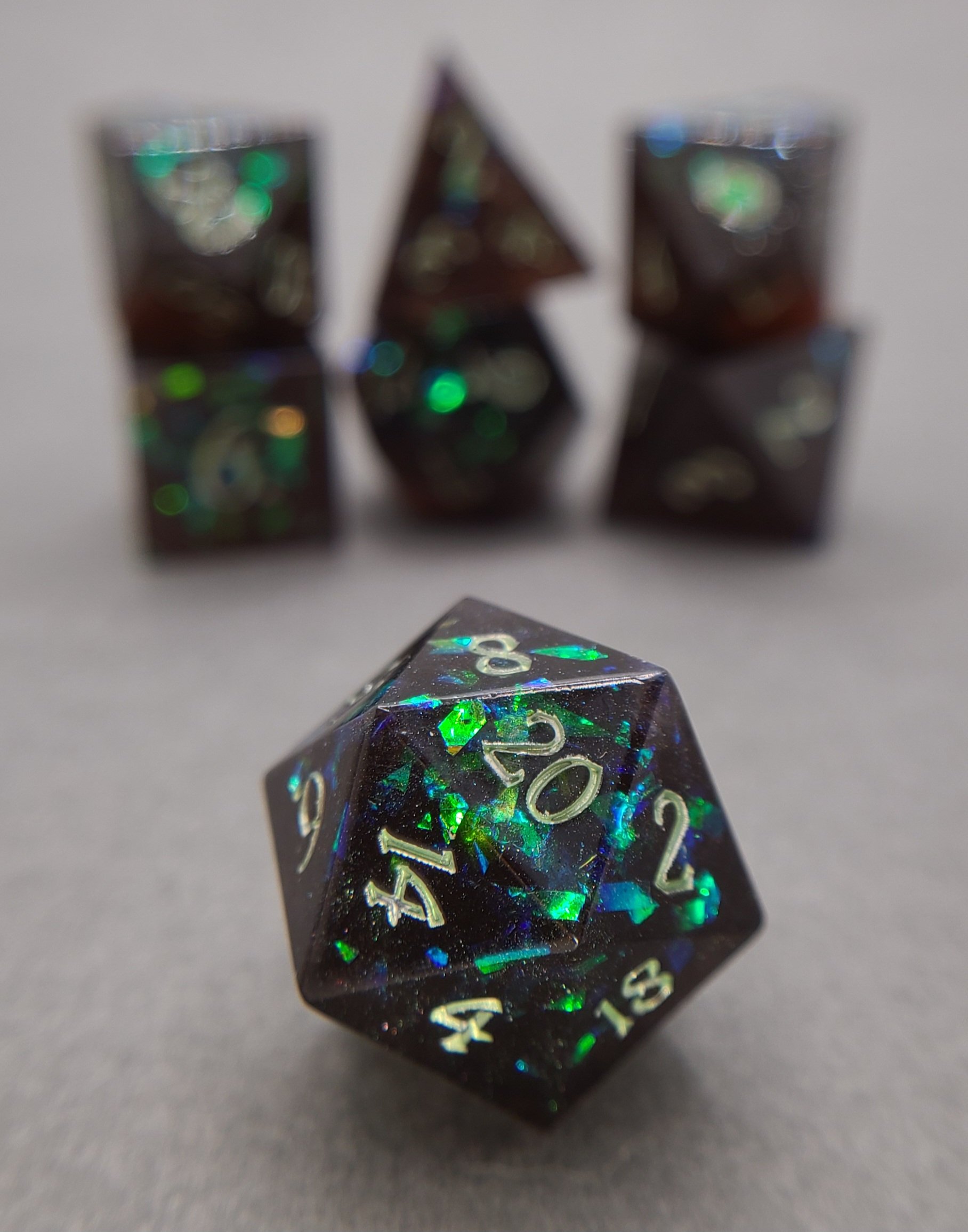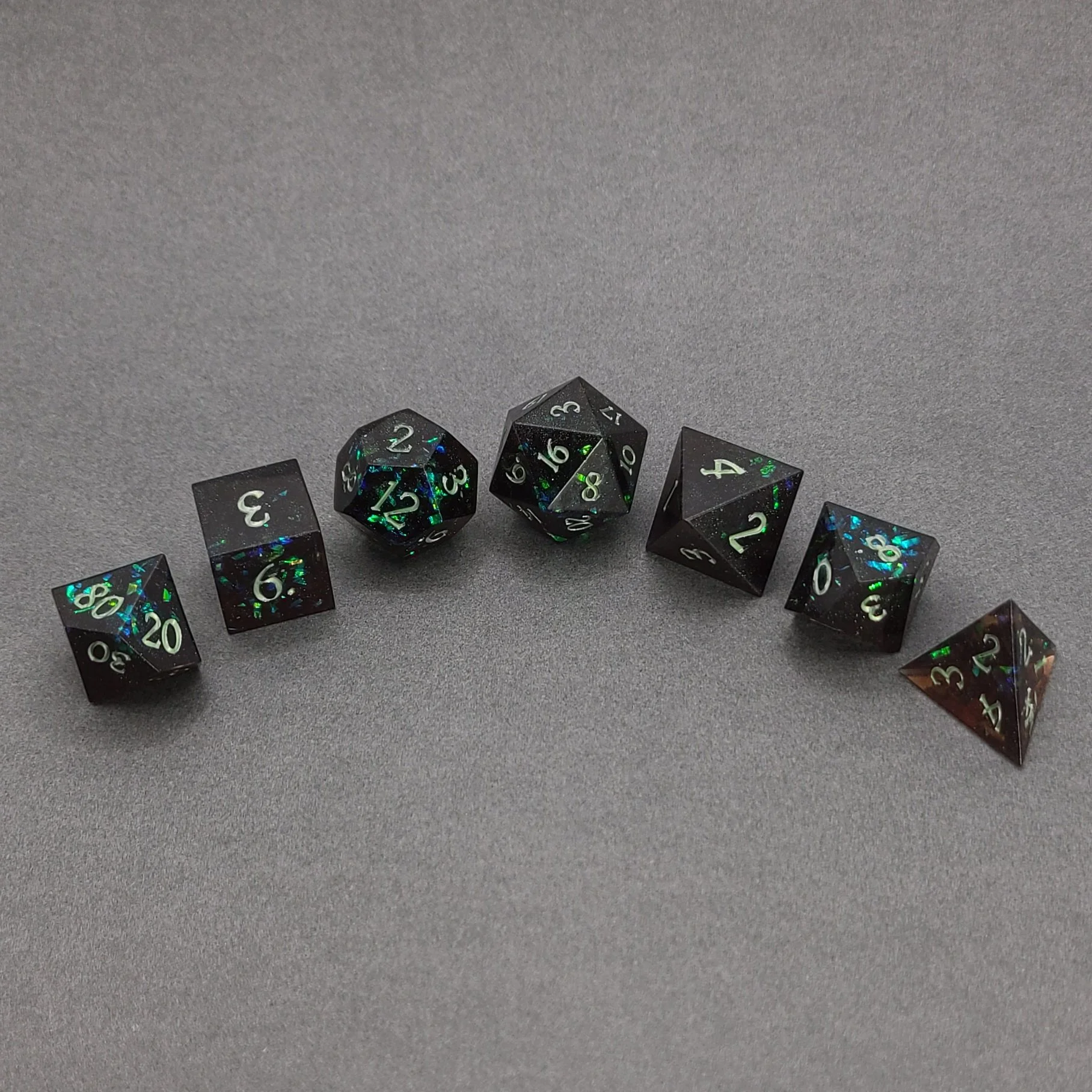 The set includes a standard 7 polyhedral dice (D4, D6, D8, D10, D%, D12, and D20).